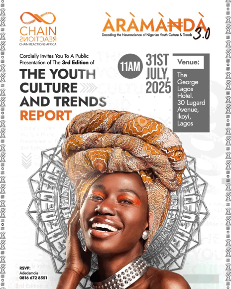Get ready to unlock the 3rd Edition of the Youth Culture and Trends Report with Chain Reactions Africa! This electrifying event dives into the neuroscience of Nigerian youth—trends, hustle, and innovation that’s reshaping the future. Expect bold insights, cultural vibes, and networking with the next generation of changemakers.